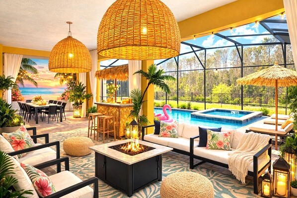• Private Pool & Hot Tub – Screened-in lanai with outdoor dining for 10+, lounge chairs, and a safety fence for kids. Best of all? Your backyard backs up to an enchanted forest, not another house — so you can swim, relax, and dine with extra peace and privacy.