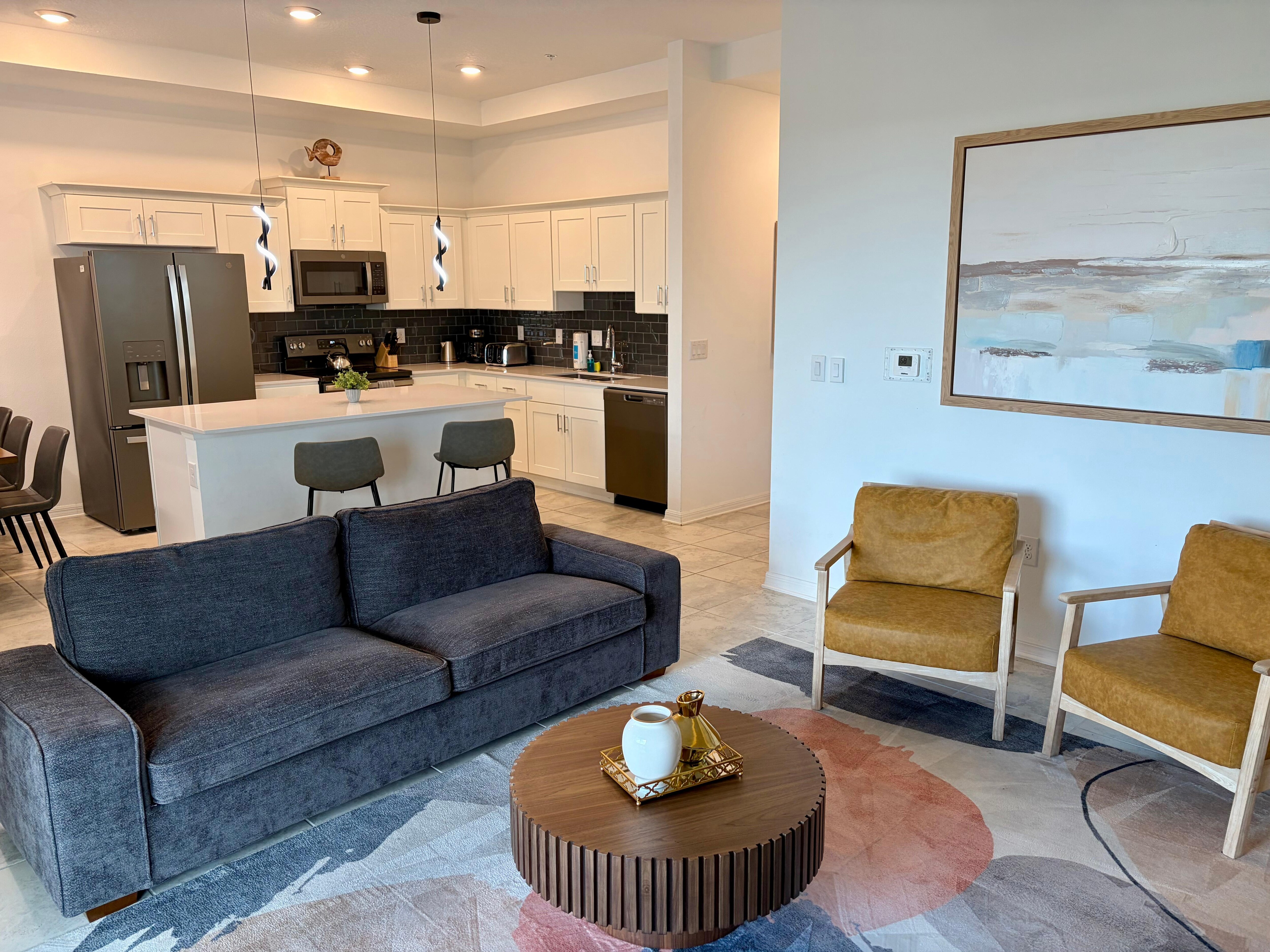 This apartment features 3 bedrooms, 2 bathrooms, and high-speed Wi-Fi, and is situated within the Store Lake Resort. One of the highlights of this property is the impressive clubhouse with a large resort-style pool, ideal for families seeking a lot of fun. The master suite is equipped with a king-size bed and a private bathroom, while the second bedroom has 1 full bed, 1 twin bunk bed, and a shared bathroom. Additionally, there's a convenient laundry area within the unit. It's just a short 6-minute drive from Walmart, 13 minutes from Disney, 14 minutes from the Premium Outlets, and 24 minutes from Universal Studios.