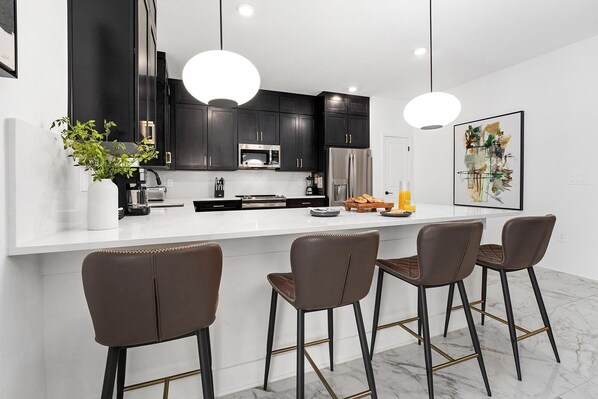 Keeping bellies full is a piece of cake thanks to this home’s fully equipped chef’s kitchen. Beautifully designed with elegant dark cabinetry, marbled counters, and stainless-steel appliances, this spacious kitchen is a natural gathering spot that includes a large breakfast counter with 4 comfortable stools. High-end counter appliances and a full complement of cookware and tableware ensure you have everything you need to cook up a feast or rustle up a midnight snack!