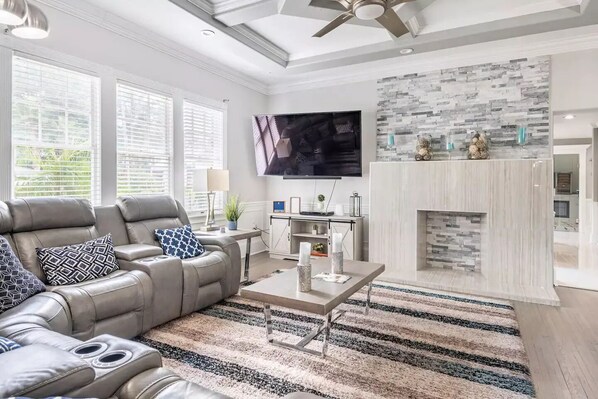 This new renovated 6000 sq ft home begins with an amazing open floor plan on the first floor which includes a gourmet kitchen, dining room for 8. The family room comes with a 80" led tv as wells as a large leather sectional sofa with electronic recliners. The living room has a 65" tv with 3 sofas and tables. The game room includes a full size pool table, as well as 6 full size arcade games. This amazing house also has 4 fire places as well as 2 master bedrooms . The first master bedroom includes a walk-in closet, fullsize bathroom with separate tub and shower with 60" tv. Bedroom 2 has a queen bed with dresser, nightstand and 42" tv. There are a total of 6 televisions in the house come that with cable, roku and netflix.