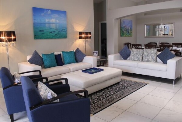 Fra stuen har du tilgang til dekket Lanai gjennom skyvedører og trekke deg tilbake til idylliske oase.