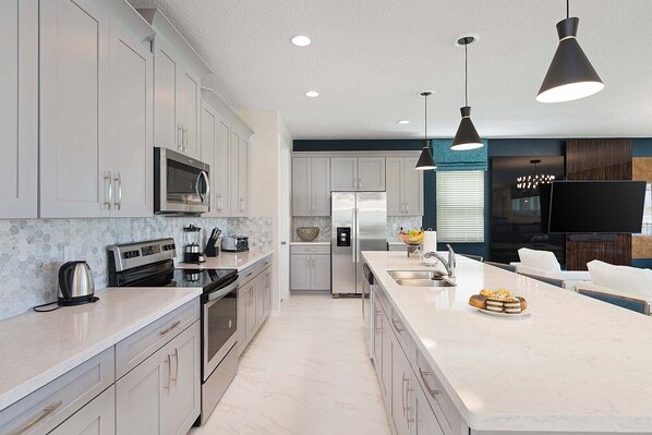 Kjøkkenet ved siden av byr på alt du trenger for måltid, inkludert et stort kjøleskap / fryser, stekeovn, mikrobølgeovn, oppvaskmaskin, kaffetrakter, brødrister og skap utstyrt med kokekar, servise og glass. Skinnende, hvite øyer gjør prepping enkelt, og de fungerer som en frokostbar, omkranset av 5 elegante avføring.