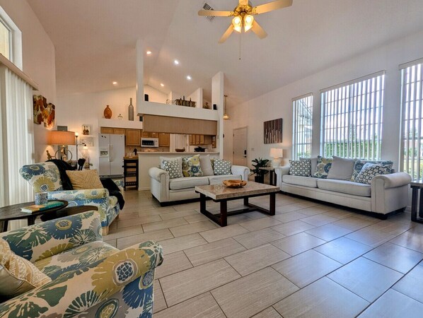Our family owned vacation home includes an open plan living space with plenty of seating for all while watching TV together, high speed internet and WI-Fi access.