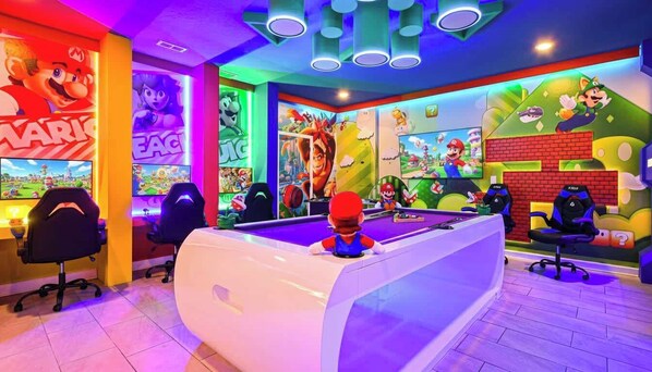 Bring on the fun in the Mario-themed game room, complete with foosball, a pool table, and two bonus bunk beds, making it a favorite hangout for kids.