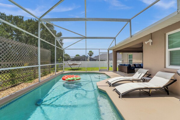 Dive into relaxation with our private pool, perfect for a refreshing swim or lounging under the Florida sun. Fire pit and outdoor TV are perfect for a cozy evening while enjoying BBQ with your family/friends.
