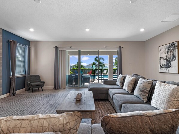 Upon entering, and a few steps inside, you'll notice the expansive living/ dining/ kitchen area, furnished with contemporary furniture and high-end kitchen appliances. In fact, the kitchen features dual refrigerators and dishwashers to make preparing meals for large groups a breeze. The spacious living area features a large comfy sectional and 86 inch mounted flat-screen television and becomes the foundation of a memorable family night. A large dining table with lots of seating can be found to the right of the kitchen.
