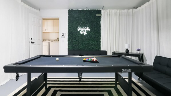 Outside, your beautiful screened-in pool is a sure highlight of the trip. Poolside lounge chairs and an outdoor dining set are arranged around the patio. The pool itself has plenty of space to swim and play, plus there’s grassy yard for playing on land. Modern Dream Disney Vacation is designed for all ages to have fun, whether that’s swimming outside or enjoying the indoor game room with pool table, smart tv, chic seating and decor, and a selection of games.