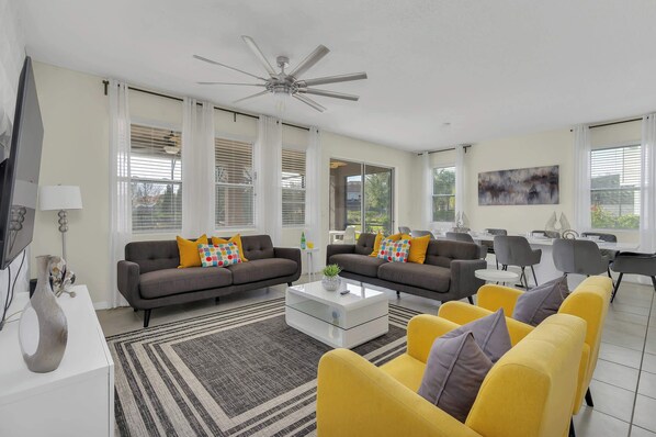 Soft Florida breezes drift across the patio as you step outside to the pool and spa, a quiet place to settle into the morning before a day of nearby theme park adventures. Evenings invite you to unwind in one of the two living areas or gather around the dining table after a long, sun-filled afternoon. With spacious rooms and thoughtful touches throughout, this home offers a comfortable retreat for large groups looking to stay close to Davenport's attractions.