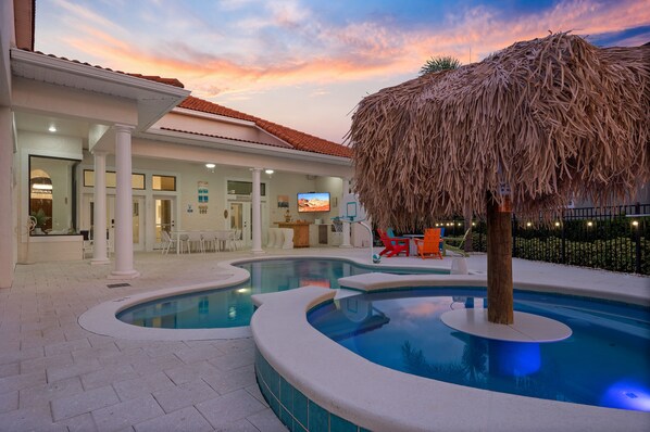 Dette luksuriøse middelhavsinspirerte tilpassede hjemmet ligger på en stor hjørneparti. Ligger på den vakre golfbanen Tom Watson Independence Reunion Resort og bare 6 miles til portene til Disney. Nyt Floridas sol på det sjeldne, utvidede bassengdekket som skiller dette hjemmet fra de fleste i Reunion. Med utendørs bordtennis, hengekøye. Den romslige Lanai tilbyr skygge og et sommerkjøkken med grill og 60 "TV. Det er høykvalitets polywood utemøbler, som et bord med plass til 12, sitteplasser for 5 rundt peisen, og 8 solsenger. Slapp av i stuen mens du ser Netflix på 75 "LED-TV. Det fullt utstyrte kjøkkenet med apparater i rustfritt stål inkluderer en Smeg-brødrister og Keurig-kaffetrakter. Spisebordet har plass til 10. Det fantastiske arkadespillrommet, konkurrer mot vennene dine på to racingarkader, PacMac Smash 4-spiller Air Hockey og Basketball. Barn blir blåst bort av Transformers Human Alliance-arkaden. Ikke glem PlayStation 4 og Xbox One spillkonsoller! Alle soverommene ligger i første etasje. Det er en King Master-soverom med en garderobe og en-suite. Det er ytterligere to King-soverom og to ungerom. Den ene har en fantastisk spesialbygget prinsesseslott køyeseng med lysbilde! Den andre er et stort rom-tema barn soverom med to doble spesialbyggede køyesenger.
