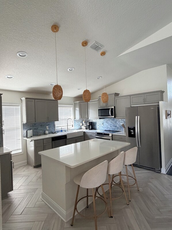 Get ready for your “PERFEKTPAUSE” relax and make wonderful memories in this 5-bedroom/3 bath pool house in Clermont. Close to Disney and Universal Studios and plenty of beautiful Golf courses. This cool property boasts 1 spacious Master bedroom with a king bed and ensuite bathroom with bathtub/shower combo, a 65 inch TV and a dedicated place to work, plenty of storage in the big walk-in closet. Second bedroom has a queen bed and a closet for storage space. The third bedroom has a queen bed, a 55 inch TV, a dedicated place to work and a closet for storage. The 2 theme kid's bedroom have both bunk beds (twin over full and 1 trundle) with plenty of storage and their own 55 inch TV. We also have a crib and a highchair at your disposal if needed. The 2 other bathrooms have showers, and are equipped with hair dryers and towels are provided. The living area is very spacious, and everyone can sit down and enjoy a nice movie on the big 85 inch TV. The dining area has a large table that can sit comfortably 8 people and there is also seating at the kitchen island. The Chef kitchen is spacious and perfect for making fabulous meals, it is completely furnished with everything you will need to cook and more! Convection/induction bran new range oven and the side-by-side fridge has ice and water dispenser. Coffee lovers will be pleased to have the choice with different kind of coffee machine: Nespresso, Keurig and drip coffee await :) A laundry room equipped with washer and dryer is at your disposal. The outdoor has an amazing big backyard to play outdoor games and a covered inground pool with pool accessories included (can be heated with a surcharge$) Nice patio area with big dining table and umbrellas for the sun, as we have sun all day long ) lounging chairs, hamac and a covered area with sofas to relax. BBQ grill at your disposal (25$ cleaning fee will be charged if used)Making it perfect for families or groups, guests will have all the comforts of home. Feel free to reach out to us during your stay - we're happy to suggest local spots to check out and fun things to do. There are beaches 1h15 min away if you want to take a break from the parks, we have beach chairs available, cooler and beach towels. If beaches are not your thing, and shopping is, well we have not one but 2 premium outlets nearby!!! So, fun for the whole family!!!! :)