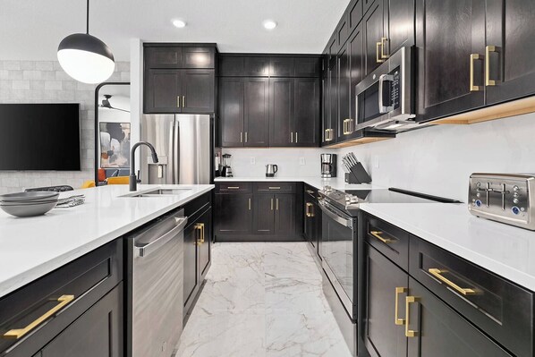 Let’s face it, it’s not a vacay without amazing FOOD–and in this villa, meals and snacks are on tap whenever you want ‘em, thanks to your own, fully-equipped kitchen! From high end appliances to a full stock of cookware and tableware, you’ll have everything you need to cook up (or warm up ;) a feast. And for an added plus, this space is easy on the eyes, with its sleek light gray cabinetry, white countertops and island, stainless appliances, and modern hanging fixtures.