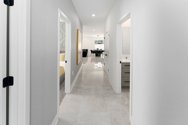 BEDROOMS (Kings, Queens, & Twin XLs): Beautiful, spacious, and comfy, the bedrooms in this townhome are the perfect marriage of style and functionality. Elegant shades of golds, grays, browns, and blues are infused throughout the decor elements–creating a rich, luxe vibe. From the chic headrests and plush beds to the artful wall designs and soft lighting, you’re bound to love everything about these sanctuaries designed for great zzz’s.