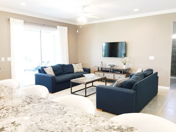 The living room has two sofas and a large 50" wall mounted TV and DVD player. Behind the sofa are sliding doors leading to the pool area.