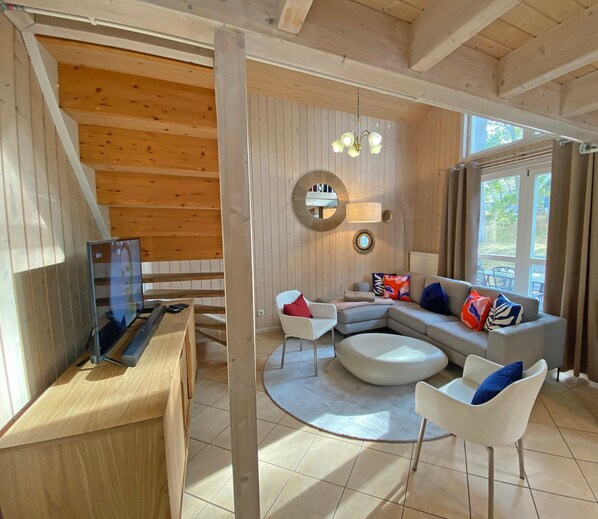 Det koselige ca 85 m² røykefrie feriehuset "Villa Musica" med peis, badstue og boblebad er optimal egnet for 6 voksne + 1 småbarn opp til 3 år i barneseng. Gjennom en liten entré med garderobe, går du inn i strandhuset ditt. Første etasje er stue / spisestue med komfortabel skinnsofa, flatskjerm-TV, mottaker og DVD-spiller med fire store høyttalere og tilkoblingskabel for MP3, smarttelefon og bærbar PC. Du trenger ikke å gjøre Internett-tilgang (WLAN). Dette er inkludert for deg. Hvis du liker det litt mer behagelig om kvelden, kan du tente peisen i stuen og la dagen falme bort. Stuen er koblet til kjøkkenet, som er utstyrt med alle hvitevarer, som du vet hjemmefra, oppvaskmaskin, kjøleskap, keramisk komfyr med stekeovn, mikrobølgeovn, kaffetrakter, vannkoker, brødrister og diverse kjøkkenredskaper. Det store spisebordet plasser 6 personer. Fra stuen er det direkte tilgang til den åpne terrassen som er utstyrt med hagemøbler. Den 1. Soverommet ligger i første etasje og er utstyrt med en dobbeltseng (1,80m x 2,00m) og garderobe. Det store badet har dusjkabinett, vaskerom, toalett, hårføner, vaskemaskin, badstue og badekar med boblebad. En bøkrepp fører til den lyse oversvømmede øvre etasjen. Det er 2 flere soverom ett med 2 enkeltsenger (0,90m x 2,00m) og den andre med en enkeltseng (0,90m x 2,00m) og en sovesofa (1,20m x 1,85m). Begge soverommene åpner ut mot balkongen. I det åpne galleriet finner du et stort elektrisk piano, elektriske trommer, akustisk gitar, musikkstativ, metronom, bongos med stativ, fiolin, harmonika og diverse litteratur og DVDer. Her kan du sette ditt musikalske talent på prøve eller bare slappe av på en sofa. Et annet lite bad med dusj, toalett, vask er også oppe. Huset har gulvvarme i kjelleren og gass sentralvarme i hele huset. For de yngre gjestene har vi 1 x høy stol klar. I vedlegget kan du lagre strandutstyret ditt. På eiendommen til stranden parken våre gjester har en parkeringsplass tilgjengelig, som ligger bare noen få meter fra huset. Du kan la din låne eller ta med sykler i huset. Husdyr er ikke tillatt. Fra 1. September 2019 er et kjæledyr en velkommen gjest. Det første utstyret til en linpakke (komplett sengetøy, 1 håndkle, 2 små håndklær) kan du bestille opp til 14 dager før ankomst mot en ekstra kostnad eller et tillegg for din egen. For pakker som er bestilt for to eller flere, vil du motta 1 oppvaskhåndkle og 1 dusjmatte en gang. Forhåndsbetaling av forbrukskostnader belastes etter individuelt forbruk (strøm 0,39 Euro / KWh, vann 7,50 Euro / m³ / gass 0,10 Euro / KWh) og refunderes etter avreise. Merk: Husene i Strandpark ligger i et biosfærereservat, så det er ikke tillatt å grille med åpen ild i Waldbrandstufe.