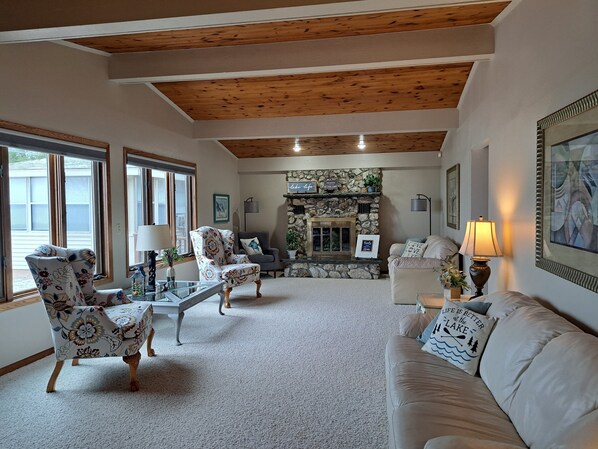 Outside enjoy the spacious 24 x 38 deck with seating for more than 20 people. The deck includes 4 tables, two benches, 3 loungers and additional tables and chairs along with an air-conditioned gazebo. You can also unwind on the additional deck with firepit near the beach.