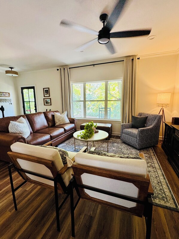 The living and dining areas feature gleaming hardwood floors and a 75-inch smart TV mounted above an electric fireplace, perfect for winding down after a day exploring Oxford. Our fully stocked kitchen includes Starbucks coffee, snacks, and condiments to get your mornings started right. A separate laundry room with washer and dryer adds to your convenience