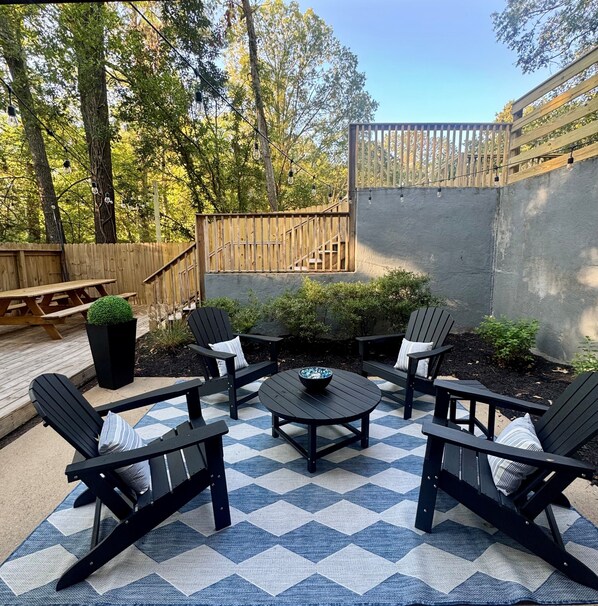 Enjoy the classic front porch with two rocking chairs and a porch swing, perfect for relaxing with a drink or watching the world go by. Out back, you'll find three levels of outdoor living space featuring a propane grill, string lights on the wire, and plenty of room to gather, dine, and unwind. Inside, the home has been completely renovated with all-new appliances, luxury mattresses, and high-end finishes throughout. Inside,
