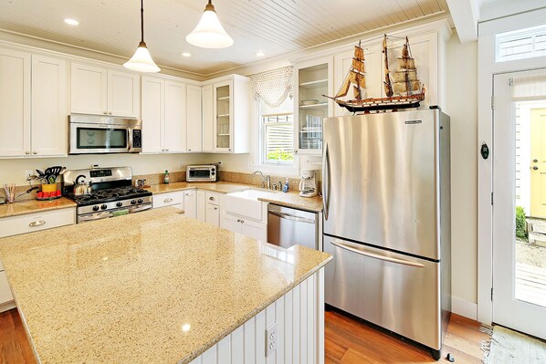 The all-white painted kitchen is a dream with a large island, granite countertops and a farmhouse sink, and outfitted with everything you will need to make everything from quick and easy to gourmet meals and holiday feasts. A crockpot, large electric pancake griddle, Cuisinart, toaster oven, toaster, large roasting pan, pasta pot, and an assortment of other pots and pans, baking utensils, and serving platters/dishes are waiting for you in the cheery kitchen with all stainless steel appliances (including a gas range). There are cute plastic plates and cups for the kids and classic white dinnerware for everyone else. There is an adorable breakfast nook with lots of natural light that seats 4 -6, and the dining room seats 6-8. A sunny yellow powder room is located off the breakfast room.