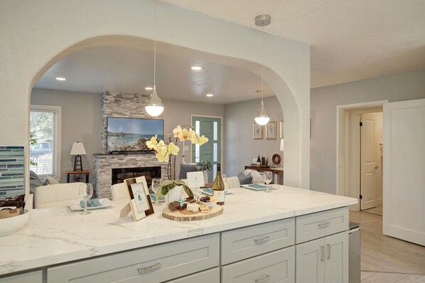A large countertop has seating for four on stylish stools. Just off the kitchen is a sun room with a small table and four chairs for another dining option.