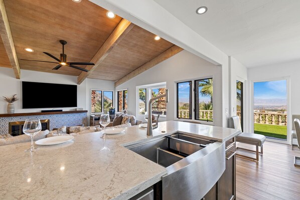 Inside the main living room has seating, a TV and views out to the pool and mountains. The second living area has seating, TV and a fireplace. The stunning kitchen has high end appliances, a huge island and extra large fridge. The dining area has seating for 8 and there are 3 more seats at the kitchen bar.
