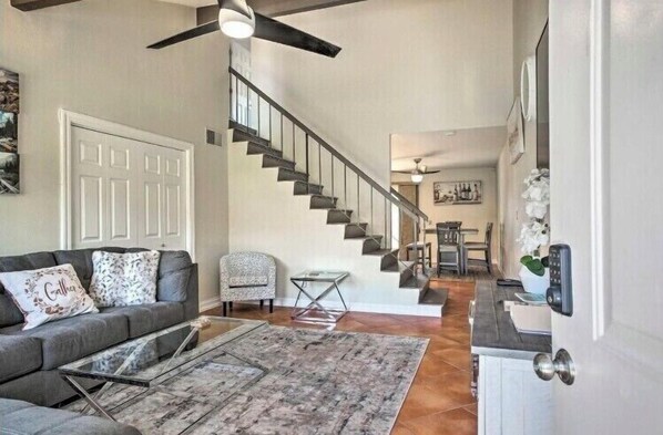 When it's time to unwind, take a dip in the outdoor pool or soak in the bubbling hot tub. Curl up on the couch and enjoy the smart TV, or challenge your friends to a game night with the selection of games and books provided. Don't forget to take advantage of the free WiFi and the in-unit laundry facilities.