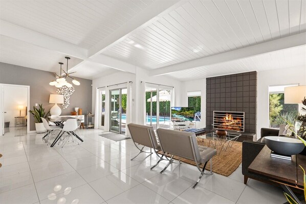 The Olive House provides an upscale getaway experience. It's in the Sunmor section, a well-known central Palm Springs neighborhood comprised of a remarkably intact collection of mid-century modern homes built in the late 1950's and early 1960's. It's designed to create a dream desert oasis where the inside meets the outside. The home was decorated with a mid-century vibe and boasts numerous amenities, including a sparkling large pool, large spa, BBQ grill, outdoor fire pit, manicured lawn, citrus trees, incredible mountain views and much more! Just a short drive from downtown Palm Springs, you will have easy access to world-renowned shops, restaurants and entertainment. Experience real comfort and luxury! The stunning interior features ceramic white tile flooring throughout with indoor-outdoor living from a large open living-dining area with decorative fireplace. Don’t forget about the gorgeous kitchen and pantry stocked with all the necessary culinary items. Plus, the oil paintings and artwork throughout the house are tribute to modernism, Coachella Valley and mid-century era! The house features a large primary bedroom with a king size bed, desk, sitting area, a walk-in closet and the tiled bathroom with multiple showering options and floor to ceiling glass. The large back bedroom has a queen size bed, desk, walk-in closet and sitting area with access to the backyard. The third bedroom has a queen bed, full closet and access via slider to the pool area. Each bedroom has its own flat screen smart TV, bathrobes and pool towels. The Olive House is also close to tennis courts, hiking/bicycling trails, golf courses and you can take walks in different neighborhoods with so many amazing mid-century homes!