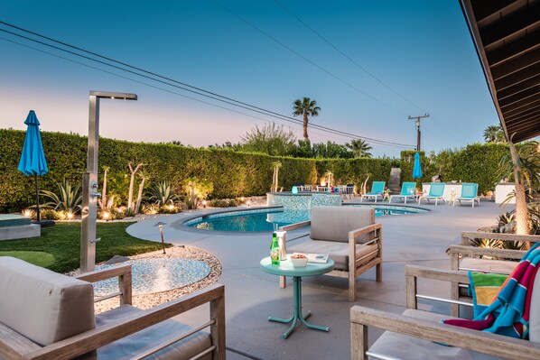 For å virkelig sette pris på og oppleve "Palm Springs Lifestyle", må du integrere din boareal med naturen. Hvis tanken på din ferieopplevelse inkluderer et fantastisk basseng og boblebad med klar fjellutsikt, har du funnet den rette eiendommen til å oppleve den med stil! Det ekspansive, frodige uterommet tilbyr uhindret, virkelig fantastisk fjellutsikt. Det er et hevet tilknyttet spa / badestamp som har en brusende foss i bassenget. Du vil føle at du er i din egen helt private oase. Den vakre uteserveringen har et bord med seks sitteplasser. En naturgass BBQ for å tilberede dine raske eller mer involverte måltider og tilbyr grillmesteren fantastisk utsikt fra sentrum av bassengkanten.