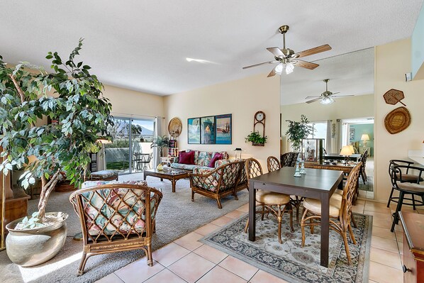 Den romslige stue og spisestue med TV, video, DVD og Stereo / Radio / CD, høyhastighets internett, telefon og Bar