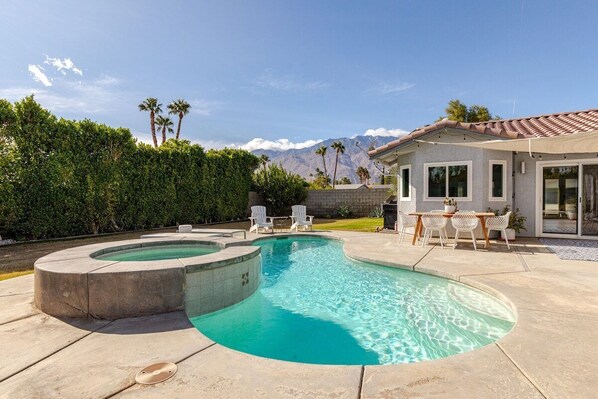 Welcome to The Desert Escape! While we're brand new to VRBO, we're not new hosts. We have a 4.95 star review average on the other listing site with 97 reviews. This spacious and bright home is a relaxing getaway with Hollywood-glam and desert-vibes. There are 4 bedrooms -- great for big groups. Enjoy the private pool, hot tub, and backyard with stunning mountain views. The open concept kitchen and living area have phenomenal lighting. We are pet and baby-friendly, with everything you need for your little ones. And if you want to work from home, we have high speed WiFi and 2 rooms with desks. Palm Springs City ID # 4458.