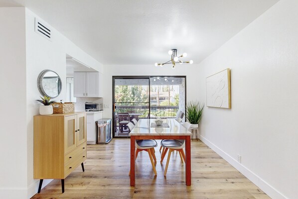 The condo's bright and stylish interior is well-appointed for modern comfort and convenience. A leather sectional and sleek smart TV are ready to welcome casual downtime in the living room, or you can enjoy drinks and meals out on the balcony. The well-equipped kitchen is appointed with ample cookware, helpful gadgets, and a full suite of stainless steel appliances. Additional in-home essentials include central air-conditioning and free WiFi.