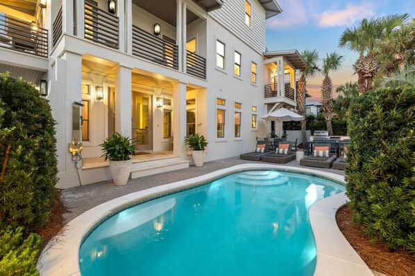 Your private backyard retreat features a seasonally heated pool, ample lounging space, an outdoor summer kitchen, and a 3rd-floor covered patio. Whether grilling poolside, soaking in the Florida sun, or enjoying the views from the patio, this space is perfect for relaxation and fun.