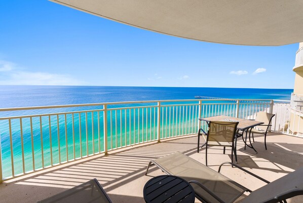 Wake up to floor-to-ceiling views of the emerald waters and step directly onto the oversized balcony to soak in the sights and sounds of the Gulf.