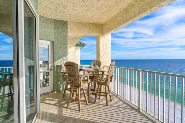 En vegg av vinduer i soverom og stue / spisestue har en fantastisk utsikt over Emerald Coast. Få tilgang til den store balkongen fra enten soverom eller stue for å nyte soloppganger, solnedganger, eller bare for å slappe av og lese en god bok. Denne leiligheten har plass til 8 personer med en king size-seng i master og to queen size-senger i det andre soverommet.