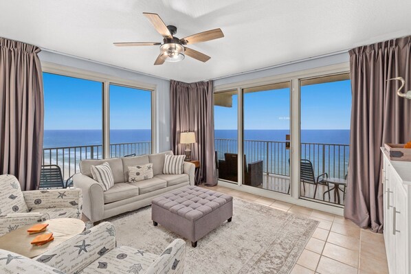 Stepping into the elegant open-concept living area where floor-to-ceiling windows frame the endless views. The newly refreshed space showcases coastal décor and premium comfortable furnishings, including a queen sized sleeper sofa, and an innovative Murphy-style twin bed in the TV cabinet, this versatile space comfortably accommodates up to ten guests. Your entertainment needs are met with a smart TV perfect for keeping up with your favorite shows and complimentary high-speed WiFi keeps you connected while spectacular views captivate from every angle.