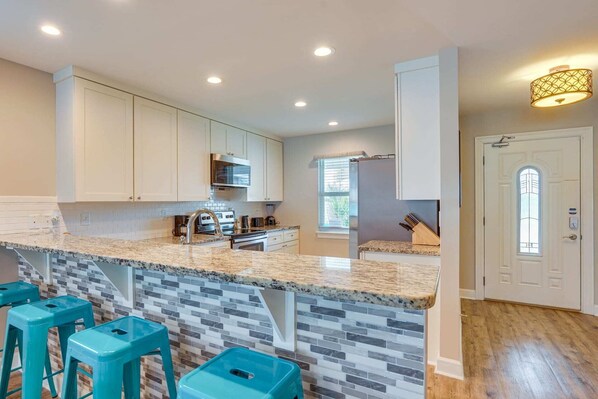 The kitchen is contemporary with stainless steel appliances, granite counter tops, a white subway style backsplash and window offering natural light. The kitchen has an open design permitting the family chef to maintain communication and connection with everyone while they prepare family favorites. Of course, with the charcoal grill in the backyard, they may spend time prepping for grilled Gulf snapper or a tuna filet purchased at one of the nearby seafood shops while friends or family enjoy a game of patio Twister and Ladderball.