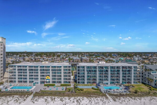 Mariner West is a small, quiet complex located on Thomas Drive on the east end of Panama City Beach. The building was recently renovated with all new windows, doors, exterior painting, and pool resurfacing. Mariner West offers guests a heated swimming pool, tennis/pickleball courts, shuffleboard, and an outdoor grilling area. It is within walking distance to several popular restaurants including Buster's Beer & Bait, Barracuda Beach Bar & Grill, & Outlaws BBQ and just a short 5-minute drive to both St. Andrew's State Park and pontoon boat rentals.