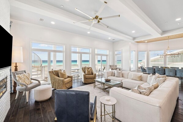 The main living room on the 2nd floor offers stunning Gulf views and is the heart of the home, connecting seamlessly with the kitchen and dining area. Gather by the electric fireplace for conversations, enjoy the unmatched scenery from the balcony, or catch a movie on the large Smart TV. The room also features panoramic windows, offering unparalleled views of the Gulf and flooding the space with natural light.