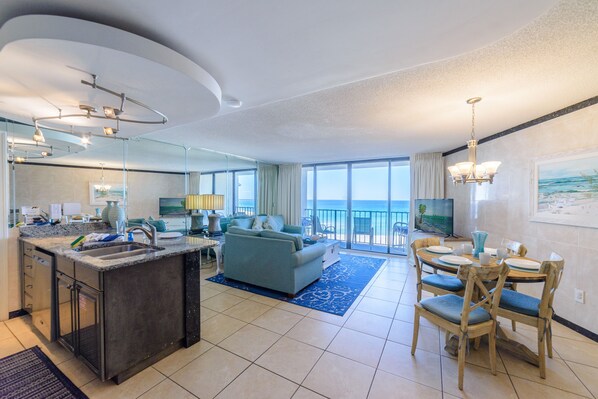 The dining area, which is also oceanfont, seats 4 at the table and has more seating for 2 at the bar. Step out the sliding glass doors onto your balcony from the living room and the dining room, the views are endless! This makes it inviting to eat in or sit and play board games or cards. Enjoy your coffee with the sounds of the ocean on your private balcony. Relax in the evening with a beverage and a fabulous sunset. Your balcony has plenty of seating.