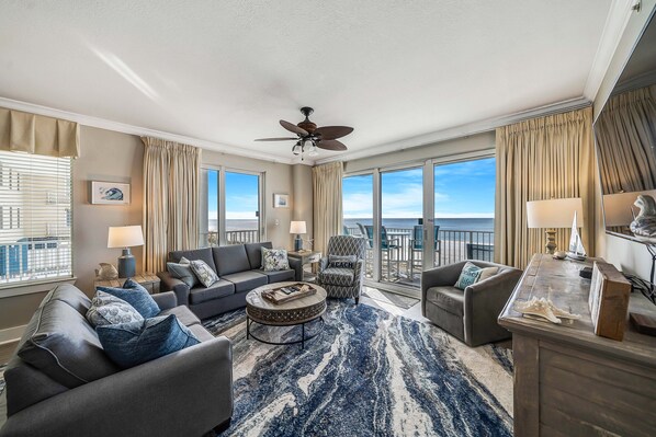 This incredibly spacious condominium offers almost 1,500 square feet of coastal living space. The fully equipped kitchen features granite countertops, stainless-steel appliances, and everything you need to cook meals for family and friends. The large dining table is perfect for enjoying meals or playing a game, and there is additional breakfast bar seating as well. The living room offers ample, comfortable seating including a recliner, with beautiful views of the gulf & swimming pool, a large flat screen television, and access to the unit's private corner balcony. The gulf front master bedroom offers a King size bed, flat screen television, dedicated workspace, access to the unit's private balcony, and its own private ensuite bathroom featuring double sinks, large whirlpool tub, and walk-in shower. The second bedroom also has a King bed, flat screen television, and access to the second full bathroom with tub/shower combo. The third bedroom has a Queen bed and its own television. The living room sofa pulls out into a Queen bed, allowing this unit to comfortably sleep 8. For your convenience, this unit also has a laundry room with a full-sized washing machine and dryer.