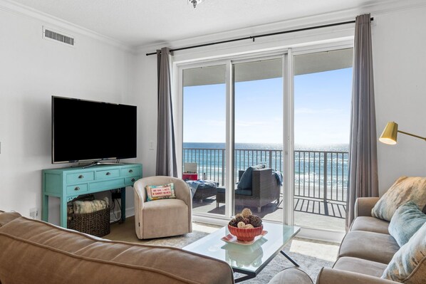 Welcome to your beachfront escape at Twin Palms Resort in Panama City Beach, where modern coastal style and sweeping Gulf views come together effortlessly. This beautifully designed condo features a bright, open layout with floor-to-ceiling glass that fills the living space with natural light and showcases the sugar-white sand and emerald waters beyond. The living area offers plush seating, stylish décor, and direct access to an oversized private balcony, perfect for lounging, enjoying morning coffee, or watching unforgettable sunsets over the water. A glass-top dining table, statement lighting, and a fully equipped kitchen with granite countertops and stainless steel appliances make gathering, dining, and entertaining easy and inviting.