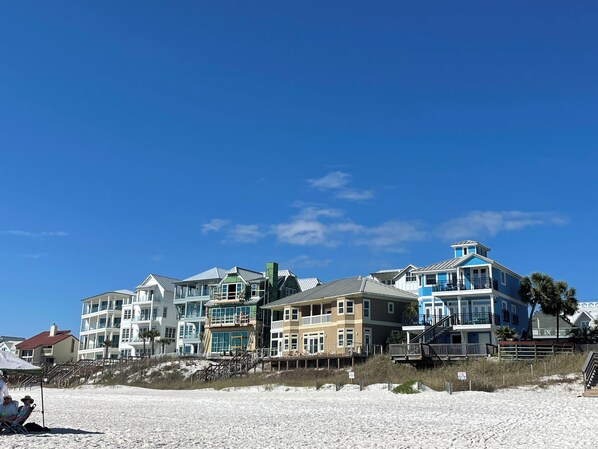 Our home is located on the west side of Panama City Beach, next to Rosemary Beach. The house is easy to spot—a gray duplex with turquoise doors and a white limestone front yard.