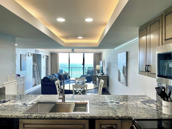 Inside is a one-of-a-kind floor plan with luxury vinyl plank floors, an open layout, and nautical decor. Soak up views of the Gulf through the sliding glass door or step out to the balcony to breathe in the fresh salty air and overlook 110 acres of beachfront.