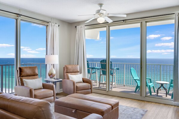 The piece de resistance is the sprawling wrap-around balcony, accessible from both the living area and primary bedroom. This outdoor sanctuary creates an infinity effect with the Gulf beyond. Impact-resistant sliding glass doors ensure peace of mind during coastal weather while maintaining the stunning views. Personally, we love heading out here early in the morning with a cup of coffee and watching the sunrise over the bright blue water before the day gets too hot. We can't think of anything more relaxing when it comes to starting a fun-filled and chilled-out vacation! It's also the perfect place to end the day enjoying the sunset with an evening cocktail while planning the next days activities.