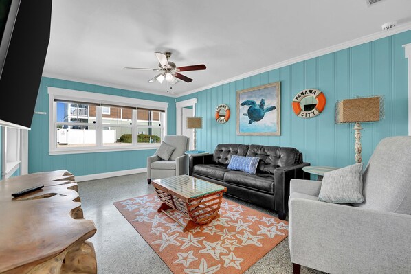 It is a beautiful house, all except that the door handle was too easy for my dog to push down on it and get out looking for me when we were out. We were so lucky that a neighbor saw her and corralled her back inside. She could have been killed on Thomas Drive. Maybe paint "no diving" on the side of the pool and put a tarp up to provide some shade; so hot. We fixed the hose nozzle. We had a very nice stay, but had to keep the front door blocked with a high stool, so she would not escape again, and had to leave the back door unlocked to get in.. LOVE the Ms. Pac Man machine that happens to have all those other games. You should really highlight that.