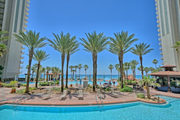 The private balcony overlooks one of the most impressive lagoon-style pools in Panama City Beach. Shores of Panama is a true gulf-front vacation resort, boasting a massive lagoon pool, fountains, waterfalls, two tiki bars, exotic tropical landscaping, a large hot tub with views of the Gulf of Mexico, an indoor heated pool, and an indoor hot tub, as well as a fitness center. Enjoy a walk along the beautiful sugar-sand beach or take a swim in the pristine emerald waters of the Gulf or the expansive lagoon-style pool.