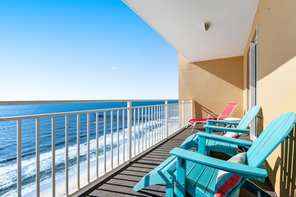 Beachfront condo with amazing balcony views, pool & complimentary beach chairs