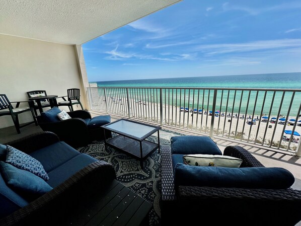 Den massive balkongen er til å dø for. Du vil ikke finne en større balkong å glede deg over med en to-roms leilighet. Den 10 fot dype og 27 fot brede balkongen er stor nok til å imøtekomme alle. Denne balkongen er et utendørs oppholdsrom og får deg til å føle deg som om du er rett på toppen av stranden. Slapp av og nyt! Nap mens du lytter til bølgene.