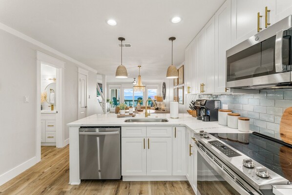 Når du går inn i leiligheten, blir du møtt av et kjøkken utstyrt med alt du trenger for matlaging i. Kjøkkenet er komplett med en ismaskin, kaffetrakter (Ny for 2018 - Combo kaffetrakter som vil brygge en pott, en kopp eller keurig stil), Håndblander, Blender, Crock Pot, Electric Skillet, Mixing Bowels, Storage Containers og en matrise av gryter, panner og krydder. Nyt fantastisk utsikt over vannet fra kjøkkenet, spisestuen og stuen på hovednivået. Et halvt bad ligger i hovedetasjen for enkelhets skyld.