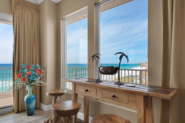 We rented a corner condo that was beautifully decorated, wrap around balcony, roomy and the views of the beach came with dolphins nearly everyday.