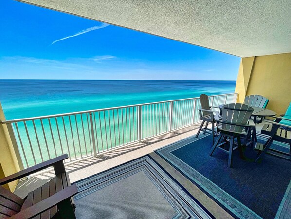 Stuen og hovedsoverommet grenser til en stor 10x28 balkong. Den ekstra balkongen boareal er perfekt for din strandferie. Spis på lyden av bølgene og majestetiske solnedganger, eller slapp av på sjesengene og ta i solen.